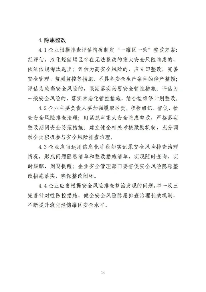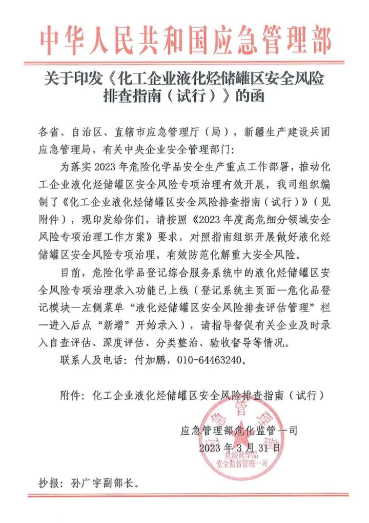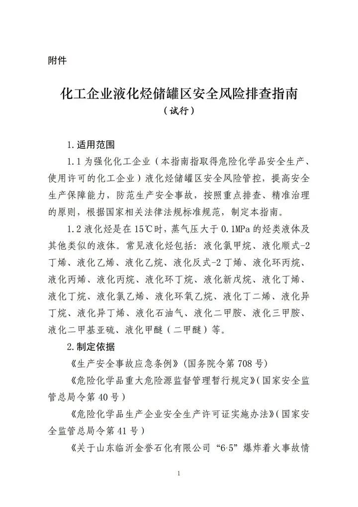 应急管理部发布《化工企业液化烃储罐区安全风险排查指南(试行)》