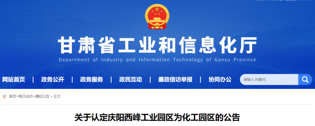 近日,甘肃省工业和信息化厅发布关于认定庆阳西峰工业园区为化工园区的公告。